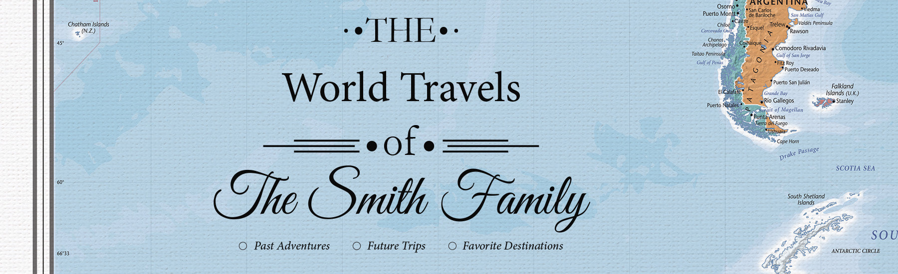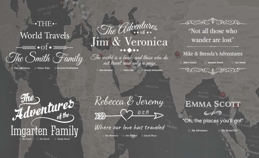 We realize one personalization design does not fit all. That’s why our graphic designer created 9 unique personalization templates for our canvas travel maps so you can truly make the map your own! Select your favorite option from the drop-down menu above and enter your text in the designated box. Your custom personalization will be printed directly on your canvas map.