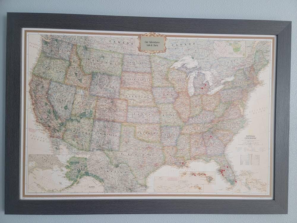 Our USA Executive Push Pin Travel Map is ideal for travelers who enjoy exploring the United States. It makes the perfect companion to our Executive World Travel Map. Use it to pin vacation destinations, office or customer locations, or even teaching in the classroom. The options for this framed map are endless. Designed by National Geographic, this United States travel map is extremely detailed and has rich tones, up-to-date information, and a popular antique look that makes it an elegant choice for just about any home, office, boardroom, or classroom.